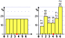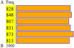 ![]() | A = 0.5 B = 6.5 6 intervalli di ampiezza 1 n = 5000 min = 1 max = 6 media = 3.5024 Con 100 prove le colonne sarebbero molto diverse, al loro aumentare tendono ad avere la stessa lunghezza. | |