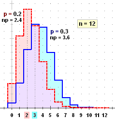 in accordo coi valori calcolati direttamente sopra. Si noti che in entrambi i casi la media, np, differisce per meno di un'unità dalla moda (in un caso differisce di 0.6, nell'altro di 0.4). Si può dimostrare che questo accade in generale, per ogni n naturale e per ogni p in (0,1). |