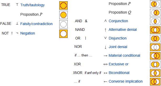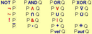 | P | Q | NOT P | P AND Q | P OR Q | P XOR Q | |