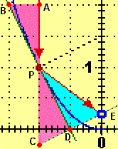 La cosa può essere confermata con un ragionamento geometrico, come quello illustrato sopra nella figura ingrandita: i triangoli rettangoli PCD e DEP sono uguali; CE ha pendenza 1/2, quindi E ha ascissa 1/4; l'angolo DPE, essendo uguale a CPD, è uguale anche all'angolo APB; dunque PE è effettivamente la direzione del rimbalzo.