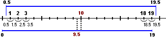 il 50° percentile corrisponde al posto che separa il primo 50% dei dati, ma non posso semplicemente prendere il 50% di 19: 50/100·19 = 9.5; infatti il posto centrale è il posto numero 10; come si vede nella figura sottostante 9.5 corrisponde al centro dell'intervallo [0, 19], mentre dovrei considerare l'intervallo