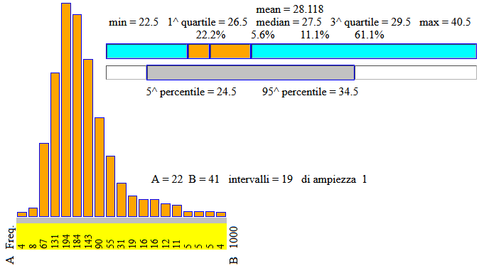 analogamente il 25° percentile corrisponde al punto che dividide il primo 25% dell'intervallo [0.5, 19.5] dalla parte rimanente, ovvero il punto che si ottiene spostando a destra di 0.5 quello che dividide il primo 25% dell'intervallo [0, 19]: 25/100·19+0.5 = 4.75+0.5 = 5.25; 5.25 sta tra 5 e 6; usando la stessa convenzione adotatta per la mediana, tra i due posti scegliamo il primo: il 25° percentile è il 5° dato in ordine crescente, ossia 157;
