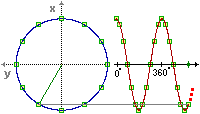 Man mano che P ruota la sua y (seno) un quarto di giro dopo diventa la sua x (coseno). In altre parole (vedi figura a destra) se ruoto di 90° il cerchio graduato iniziale la quota a cui si trova P non è più la sua ordinata ma la sua ascissa. Con una animazione simile alla precedente (vedi figura sotto a sinistra) ottengo il grafico della ascissa di P in funzione della rotazione complessivamente descritta dal raggio OP.