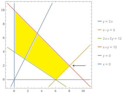 plot y=2x, x-y=6, 2x+3y=12, x+y=10 , y=0 , x=0, -1 < x < 11, -1 < y < 11