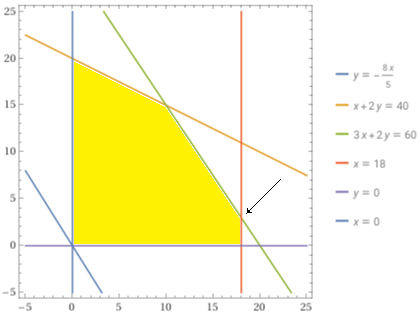 plot y = -16000*x/10000, x+2y=40, 3x+2y=60, x=18 , y=0 , x=0, -5 < x < 25, -5 < y < 25