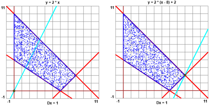 • Si rappresenta graficamente il sistema dei vincoli nel piano ottenendo la regione delle soluzioni ammissibili (o dominio dei vincoli). Se l'insieme non è vuoto, tale area può essere rappresentata da un poligono, o da una poligonale illimitata, che possono eventualmente ridursi ad una semiretta, ad un segmento o ad un punto.