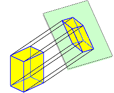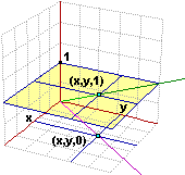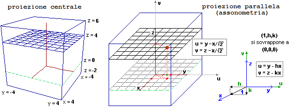 proiezioni Sotto, il piano z = 4 è rappresentato sia in prospettiva centrale (a sinistra) che con una assonometria. A destra è descritta la trasformazione da R3 in R2 che corrisponde a questo tipo particolare di assonometrie (man mano che avanzo di 1 nella direzione x, nella immagine bidimensionale retrocedo di h nella direzione y e di k nella direzione z). Una assonometria in cui, come in questa, il piano su cui avviene la proiezione (u,v) è parallelo ad uno dei piani del sistema di riferimento (y,z) viene detta assonometria cavaliera. | ![]() |