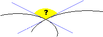 | Precisare il concetto e il modo di tracciare le tangenti ci serve anche per affrontare situazioni come quella illustrata a lato: qual è l'angolo formato da due traiettorie non rettilinee che si intersecano? È naturale prendere l'angolo formato dalle rette tangenti alle due traiettorie nel punto di intersezione. | ![]() |