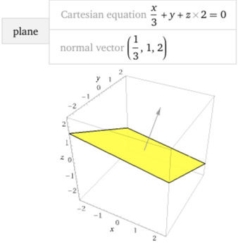 Un piano e una sua normale tracciati con WolframAlpha: plane x/3+y+z*2 = 0, vector(1/3,1,2) |