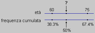 Devo dire "circa" perchè nel fare il calcolo ho fatto finta che (tra 60 e 75 anni) le variazioni di età e le variazioni della frequenza cumulata siano proporzionali (cioè che per ogni anno ci sia lo stesso numero di morti). Per una stima più precisa dovrei disporre di una classificazione in intervalli di età più piccoli.