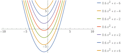 plot y = 0.6*x^2 + x + c for c = -6, -4, -2, 0, 2, 4, 6, x=-10..10, y=-8..8