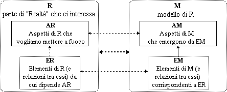 Mi restringo al primo uso, illustrato dalla figura seguente: modello come rappresentazione semplificata di una porzione di realtà (che interessa in un certo problema), impiegata per: migliorare la "visualizzazione" di alcuni aspetti (una riproduzione in scala al posto della figura originale), generalizzare proprietà (regole grammaticali), permettere confronti (la densità di popolazione invece dei dati sulla popolazione e sulla superficie per confrontare due regioni), ... .