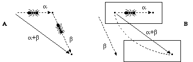 10. La composizione di due spostamenti consecutivi (nella figura A sottostante, la formica che si sposta secondo α e poi secondo β dando luogo allo spostamento complessivo α+β) è la situazione prototipo tipica che viene associata alla addizione tra vettori. L'estensione di questo modello al caso in cui gli spostamenti non siano consecutivi (in B la formica si muove lungo il foglio, con una certa legge oraria, compiendo lo spostamento α, mentre il foglio viene trascinato secondo β) non è affatto banale. Tuttavia la costruzione delle relazioni tra concetto di vettore e grandezze vettoriali spesso, da parte degli insegnanti sia di matematica che di fisica (che spesso coincidono), viene affidata a questa solo situazione, banalizzando in entrambe le direzioni i rapporti tra matematica e fisica.
