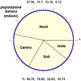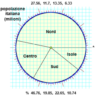 Dati = [1530, 452, 832, 708] Dati = [27.56, 11.70, 13.35, 6.33] // ------------------------------------------------------------------------------------------------ // Puoi aggiungere 10 scritte (S) grandi (T) e/o piccole (s) in diverse posizioni (x,y) coi comandi // T0=["S",x,y],...,T9=["S",x,y], s0=["S",x,y],...,s9=["S",x,y] (x e y tra -1.2 e 1.2) T0=T1=T2=T3=T4=T5=T6=T7=T8=T9=s0=s1=s2=s3=s4=s5=s6=s7=s8=s9=""; griglia=0 // Puoi scrivere i comandi T0=...,..., s9=... qui sotto. Se vuoi una griglia metti sotto griglia=1 T0=["Nord",0,0.45] T1=["Centro",-0.6,-0.25] T2=["Sud",0.1,-0.55] T3=["Isole",0.6,-0.2] T4=["popolazione",-1.1,1.1] T5=["italiana",-1.1,0.96] T6=["(milioni)",-1.1,0.81] ...