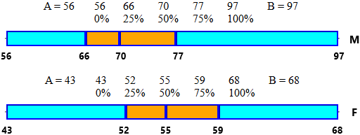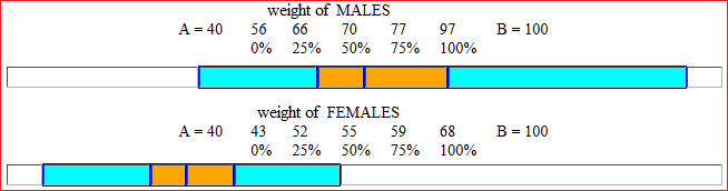 La seconda, ottenuta in modo simile, rappresenta la distribuzione dei pesi delle femmine: il peso minimo è 43 kg, il massimo è 68, il mediano 55, il 25º e il 75º percentile sono 52 e 59.