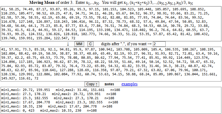 Si mettono i dati di cui fare le medie mobili nella prima finestra (finestra di input), si clicca [MM]; si ottengono le medie mobili nella seconda finestra (di output]. Se si vuole ripetere la procedura si clicca [Copy] e le medie mobili ottenute vengono copiate nella prima finestra, si clicca [MM] e si ottengono nella seconda finestra le nuove medie mobili, e così via, se si vuole continuare. Nella terza finestra viene ricordato quanto via via fatto. Gli esiti vengono calcolati con (circa) 10 cifre dopo il ".". Se i dati sono dell'ordine delle centinaia si può ridurre il numero delle cifre (ad es. mettere [2 ]). Se clicco [C] vengono pulite le finestre di input e di ouput.