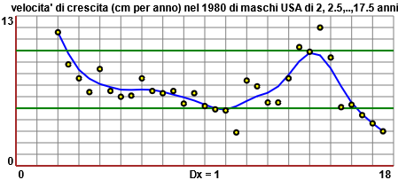 Second example. Below are the growth rates (cm per year) of a group of North American males around 1980. We graphically represent the trend using appropriate moving averages and estimate how much the growth rate varies from the onset of puberty (minimum point, around at 10 years) to the peak value which it reaches shortly after (around 14 years). In the case of females the trend is similar, but anticipated by more than a year.