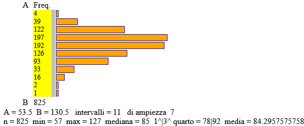 The sample is 825 males, in 11 classes: 54-60, 61-67, 68-74,.., 124-130, ie. [53.5,60.5),
