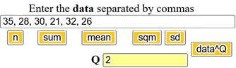 [n], [sum], [mean], [sqm], [sd] e, messo 2 in Q, [data^Q], copio l'esito e clicco [sum]