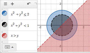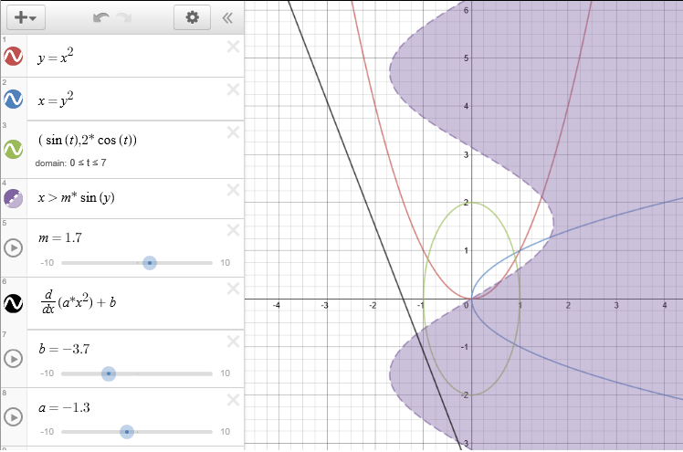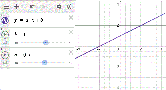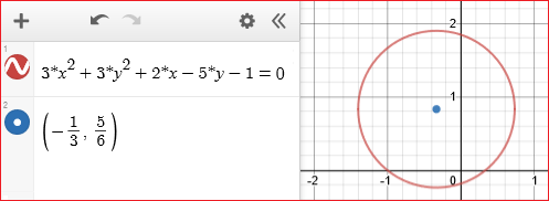 "clicca" Elaboratore grafico "metti nel box 1" y = 2*x "metti nel box 2" y = x/2 "metti nel box 3" y = k*x "clicca" k "fai scorrere il pallino sulla riga seguente" "clicca il cerchietto (||)"Poi "clicca i primi tre cerchietti per far sparire i grafici" (oppure clicca le corrispondenti X sulla destra) "metti in un nuovo box" (x+2)^2+(y-1)^2 = 4 (puoi batterlo o copiarlo da qui e incollarlo) "metti nel box successivo" (-2, 1) "che cosa ottieni?"