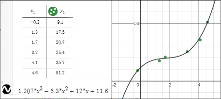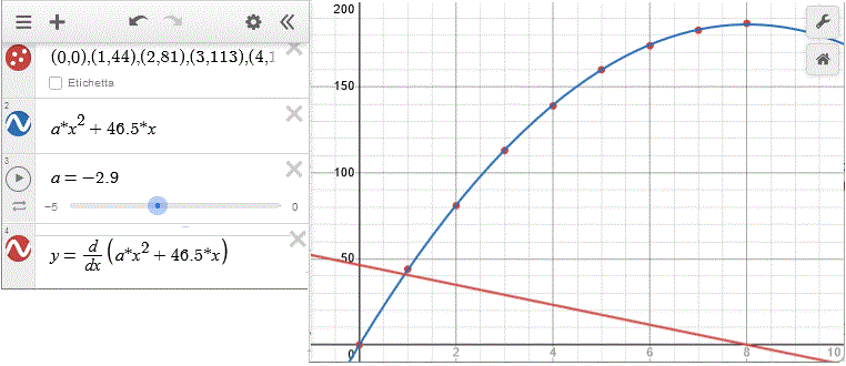 Azionando lo slider posso modificare l'andamento della curva (parabola) e vedere che essa approssima al meglio i punti tracciati quando