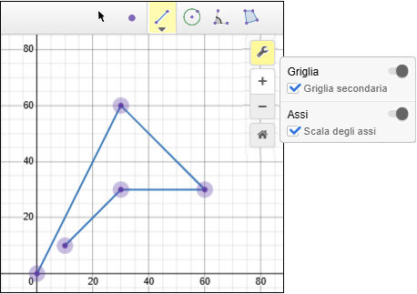 Copio queste coppie nel box 1, clicco la chiave inglese e cambio la scala nel modo indicato a destra. Ottengo i punti sotto tracciati in rosso. Poi metto