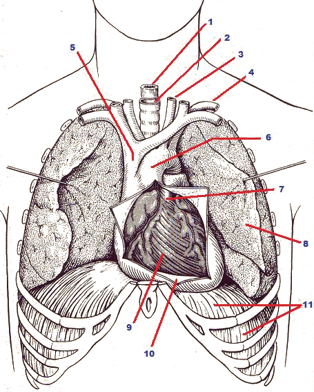 1 esofago 2 trachea 3 carotide 4 arteria brachiale 5 vena cava superiore 6 aorta 7 arteria polmonare 8 polmone (sollevato a lato) 9 cuore (miocardio) 10 pericardio (aperto) 11 diaframma |