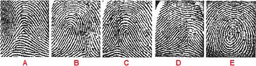 B impronta con ansa a sinistra C impronta con ansa a destra D impronta ad arco triangolare E impronta a figura chiusa con forma circolare, ellittica o a spirale |