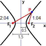 Una iperbole è l'insieme dei punti del piano le cui distanze da due punti fissati (detti fuochi) hanno differenza costante. Nel nostro caso: 1.25-0.25 = 1.3-0.3 = 1.42-0.42 = ... = 1. La distanza tra i fuochi è 1.5. La distanza tra i due rami dell'iperbole è 1.