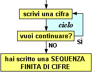 Un numero naturale è formato da una sequenza finita di cifre. Scrivo una cifra; se voglio scrivo a destra un'altra cifra; e così via. Quando mi fermo posso esprimere con una parola il numero che ho scritto. Il diagramma a sinistra illustra questo procedimento. |