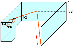 [8] Un raggio di luce, leggermente inclinato rispetto al piano orizzontale, entra nella infinita "spirale" di specchi raffigurata sotto (a destra è vista dall'alto). Il primo tratto rettilineo percorso nella spirale è lungo 1 m, il secondo è lungo 1/2 m, il terzo 1/4 m, il quarto 1/8 m, . Secondo te prima o poi il raggio di luce esce da questo "percorso guidato"? Con quale eventuale direzione? | |