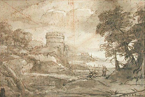 | In altri dipinti, risalendo ai disegni di prova originali, si intravvedono i segni dell'organizzazione spaziale, come in questo paesaggio di Claude Lorrain. | ![]() |