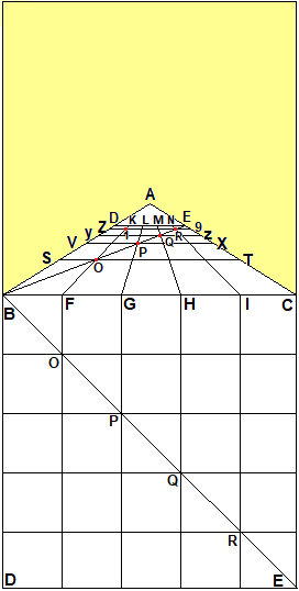 | Sia un quadrato in prospettiva BCED costruito utilizzando il teorema XIII, si divide il lato BC in parti uguali individuando i punti F, G, H, I. Si considerano dunque le rette parallele uscenti da tali punti che, essendo in rappresentazione prospettica, devono confluire nel punto di fuga individuato dalla costruzione iniziale del quadrato. Esse intersecano il lato DE nei punti K, L, M, N. Si traccia la diagonale BE che individua i punti O, P, Q, R intersecando rispettivamente le rette FK, GL, HM, IN. | |