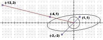 trasforma il cerchio unitario e due particolari vettori, (1,1) e (-4,1), che sono due autovettori: