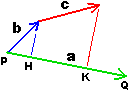 Inoltre a·(b+c) = a·b+a·c. Infatti (vedi figura a lato) a·(b+c) equivale al prodotto di ||a|| (lunghezza di PQ) per la proiezione su a di b+c (PK), e questa è pari alla somma delle proiezioni su a di b (PH) e c (HK), che sono pari ad a·b e a·c. Poi (ku)·v = k(u)·v.Infatti se moltiplico per k un vettore viene moltiplicata per k anche la sua proiezione su un altro vettore v. Dunque: | ![]() |