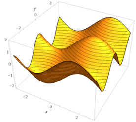 Nel caso di F(x,y) = sin(x) + cos(2 y) abbiamo HF(x,y) = −sin(x)·(−4·cos(2y)) − 0 = 4·sin(x)·cos(2y). In (−π/2,0), che è un punto stazionario, HF(−π/2,0) = −4 < 0, quindi (−π/2,0) è un punto di sella, in accordo con quanto avevamo già concluso nel §4. Con WolframAlpha: