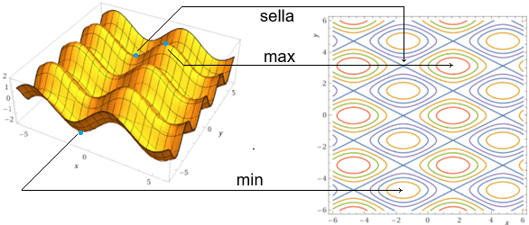 Abbiamo visto (qui) come lo studio della derivata seconda possa essere utile per determinare la natura dei punti in cui si azzera la derivata prima. Analogamente lo studio delle derivate seconde di una funzione di due variabili può essere di aiuto per determinare la natura dei punti in cui si azzerano le derivate prime. Accenniamo, senza dimostrazioni, a questi aspetti, lasciandone l'approfondimento a chi proseguirà gli studi in ambito scientifico.