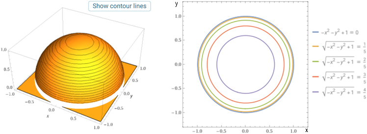 Tracciata la superficie con 3d plot z=sqrt(1-x^2-y^2), x=-1..1, y=-1..1 posso anche visualizzarla evidenziando le curve di livello (figura sotto a sinistra), che posso tracciare meglio (figura a destra) col seguente comando: