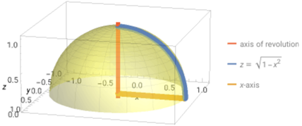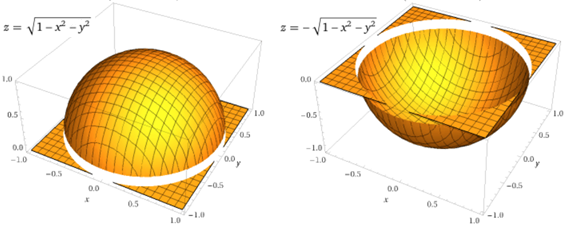 Analogamente una sfera non può essere pensata come il grafico di una funzione di due variabili, mentre possono esserlo o la semisfera che sta al di sopra del piano orizzontale che la taglia in due parti uguali o quella che sta al di sotto di essa. Cerchiamo di descrivere analiticamente la funzione F che ha come grafico la metà superiore della sfera di raggio 1 centrata in (0, 0, 0). Vedi la figura sopra a destra.