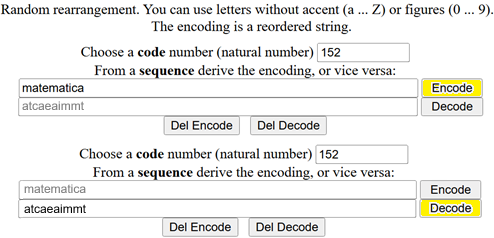 Se clicchi QUI si avvia un programma che ti consente di codificare e di decodificare parole o numeri, riordinando le lettere o le cifre che li compongono. Due esempi: