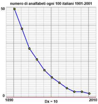 Questi sono due interviste contenute nel libro Il mondo dei vinti - testimonianza di vita contadina, di Nuto Revelli. Qui sotto è riportato il numero di analfabeti ogni 100 italiani che era presente nella popolazione italiana nei cento anni che vanno dal 1901 al 2001. Riporta questi dati in un grafico, che puoi tracciare su carta quadrettata o millimetrata. Prova poi a commentare che cosa emerge da queste interviste e da questo grafico, e a dire che cosa ti ha impressionato.