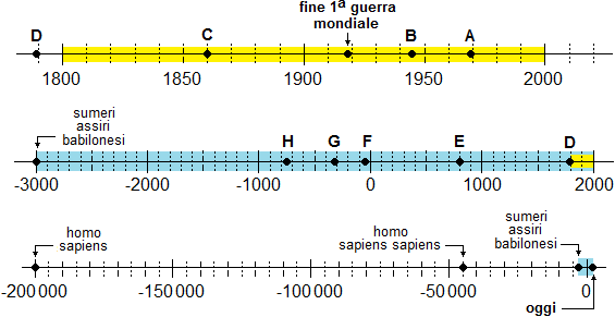 Cercate a quando risalgono i seguenti avvenimenti e associate ad essi le corrispondenti lettere sulle linee del tempo sotto tracciate: