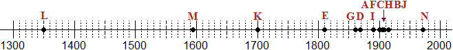 A 1900, B 1915, C 1907, D 1869, E 1810, F 1905, G 1861, H 1907, I 1890, J 1915, K 1700, L 1350, M 1595, N 1971.