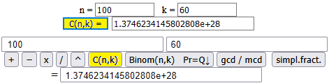 Ovvero posso usare, ad esempio, WolframAlpha:    choose(100,40)   fornisce  lo stesso risultato.