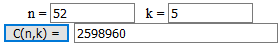 52 scelte possibili per la prima carta, 51 per la seconda, , 48 scelte per la quinta. In tutto 52·51·50·49·48 modi di pescare le 5 carte. Ma non importa l'ordine con cui le pesco. Gli ordini possibili sono 5·4·3·2. Quindi il numero di possibili di mani che posso avere sono: