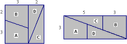 Le quattro sottofigure possono essere ricomposte, senza buchi o sovrapposizioni, in un rettangolo di dimensioni 3 e 8 solo se α (e β) è uguale a γ (e a δ), e la verifica di questa condizione nella dimostrazione viene trascurata. Se effettuo la scomposizione e la ricomposizione concretamente, con carta e forbici, posso verificare che le quattro figure si sovrappongono: