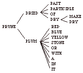 Se ad esempio cerchiamo prune troviamo "dried plum". Cerchiamo dried e troviamo "past participle of dry". Il significato di participle, di past e di of non è descritto esaurientemente dal dizionario (ci sono dei "giri di parole" e degli esempi); infatti si tratta di parole che fanno parte del "defining vocabulary" (sono nodi finali nel grafo a fianco). I loro corrispondenti italiani sono "participio", "passato" e "di". Per il verbo dry troviamo "make dry". Il verbo make e l'aggettivo dry fanno parte del "defining vocabulary". I loro corrispondenti italiani sono il verbo "fare (rendere, )" e l'aggettivo "secco". Per plum troviamo "red, blue-red or yellow fruit with a stone in it". Le parole presenti in questa definizione fanno tutte parte del "defining vocabulary". La traduzione è "frutto rosso, blu-rosso o giallo con dentro un nocciolo". Hai capito il significato di prune? Come tradurresti in italiano prune? Trovi delle analogie con la definizione dei significati della parole in matematica? |