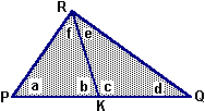 è raffigurato un generico triangolo. K è un punto interno al lato PQ. Si ha: a+b+f = S e c+d+e = S. Quindi a+b+f+c+d+e = 2S. Ma anche a+d+(e+f) = S, mentre b+c = 180°. Quindi S+180° = 2S, da cui 180° = S. |
