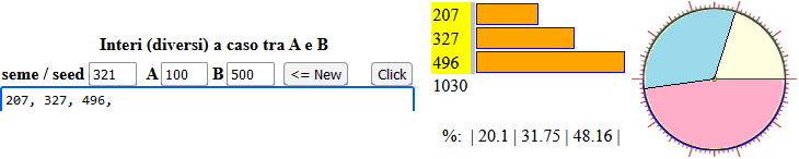 interi diversi che si distribuiscono del tutto a caso tra due numeri A e B. Scegliendo un "seme" diverso (nella figura sotto a sinistra il seme è 321) vengono generati numeri in modo differente. Metti 100 come A e 500 come B. Scegli un seme, clicca New e clicca 3 volte Click.
