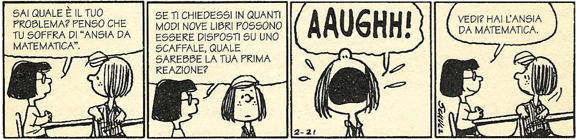 Peppermint Patty di fronte alla domanda di Marcie "in quanti modi posso disporre uno a fianco all'altro 9 libri?" si mette a piangere. Prima di metterti a piangere anche tu, prova a trovare la risposta. Prima trova in quanti modi posso disporre 2 libri, poi trova in quanti modo posso disporne 3, poi trova in quanti modo posso disporne 4. Cerca poi di rispondere alla domanda di Marcie, aiutandoti con la calcolatrice per svolgere i calcoli.